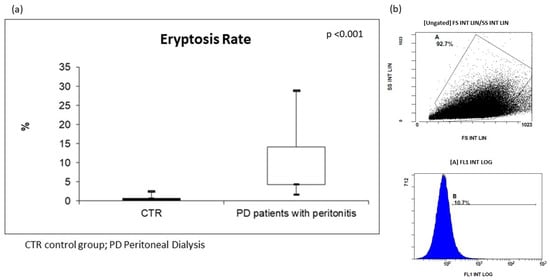 Figure 1, the percentage of AnnexinV-binding RBCs was significantly higher in PD patients with peritonitis than in CTR (PD patients with peritonitis: 7.7%; IQR 4.3–14.2, versus CTR: 0.8%; IQR 0.7–1.3;