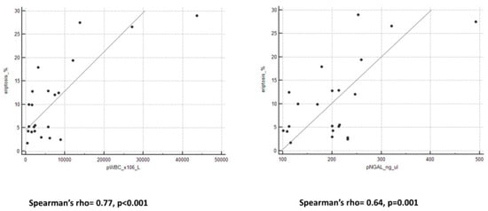 p = 0.05). Furthermore, we reported positive strong correlations between pNGAL and cytokines levels (IL-1β: Spearman’s rho = 0.64,