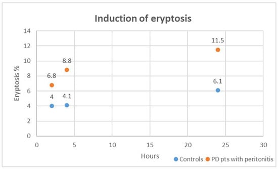 We performed an in vitro study with healthy RBCs exposed to plasma of PD patients with peritonitis and CTR at 2, 4, and 24 h. Finally, we compared the induction of eryptosis rate after exposure of RBCs in these 2 groups at different time points.