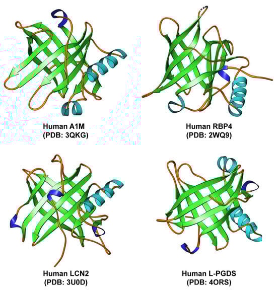 Structure of selected human lipocalins. Human α1-microglobulin (A1M), retinol binding protein 4 (RBP4), lipocalin 2 (LCN2), and lipocalin-type PGD2 synthase protein (L-PGDS) all share a highly similar structure with a typical eight-stranded, antiparallel symmetrical β-barrel fold. The structures of the discussed lipocalins were created using Ribbons XP software (version 3.0) and the coordinates 3QKG, 2WQ9, 3U0D, and 4ORS deposited in the RCSB Protein Data Bank (http://www.rcsb.org, accessed 6 April 2024).