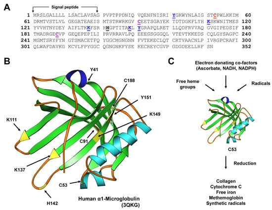 Physiological roles of α1-microglobulin (A1M). (A) The sequence of the human A1M preproprotein consists of 352 amino acids. The N-terminal part of the protein contains a 19-amino acid signal peptide that is cleaved during protein processing. The sequence was obtained from the NCBI Reference Sequence with access number NP_001624.1. Functional relevant amino acids are given in bold and are underlined. The relevance of these amino acids in explained in the legend to panel (B). (B) A1M possesses the typical lipocalin fold. The protein has the ability to protect cells and organs against oxidative stress-related injury. This activity is mediated by a strongly electronegative surface-exposed cysteine residue (C53 according to the position in the pre-pro-protein) located in loop 1 at the open end of the β-barrel. This residue can participate in one-electron oxidation and reduction conditions. Several targets for covalent modification (K111, K137, K149, Y41, and Y151), the heme binding residue (H142), and the residues forming the intramolecular disulfide bridge (C91, C188) are marked. In the structure, the mentioned functional relevant amino acids with selected functional activities are marked in yellow. (C) In particular, the free thiol group at position C53 allows A1M to reduce several biological targets (collagen, cytochrome C, free iron, methemoglobin) and synthetic radicals such as 2,2′-azino-bis(3-ethylbenzothiazoline-6-sulfonic acid). The reducing capacity of A1M depends on electron-donating co-factors such as ascorbate, nicotinamide adenine dinucleotide (NADH), nicotinamide adenine dinucleotide phosphate (NADPH), or other physiologically active electron-donating co-factors. For more details on the structure, functions, and physiological roles of A1M, refer to [].