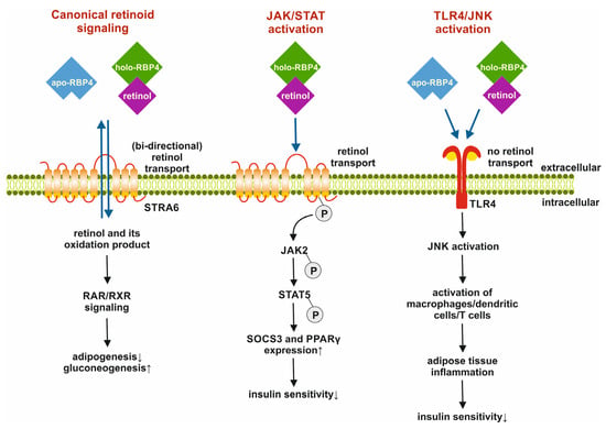 Metabolic activities of retinol binding protein 4 (RBP4). RBP4 can activate pathways related to canonical retinoid signaling and general cell metabolism. When RBP4 binds to the signaling receptor and transporter of retinol STRA6 (STRA6), it facilitates the transport of retinol across the cell membrane. This process mediates retinoic acid receptors/retinoid X receptors (RAR/RXR) signaling, which promotes gluconeogenesis and inhibits adipogenesis. The binding of holo-RBP4 can lead to the phosphorylation of STRA6, which then recruits and activates Janus kinase 2 (JAK2) and triggers signal transducer and activator of transcription 5 (STAT5) phosphorylation. This, in turn, induces proliferator-activated receptor γ (PPARγ) expression and lowers insulin sensitivity. Both apo- and holo-RBP4 can also trigger pro-inflammatory responses in immune cells by binding to toll-like receptor 4 (TLR4). This binding activates c-Jun N-terminal protein kinase (JNK), which is linked to the activation of macrophages, dendritic cells, and T cells. This activation can lead to inflammation in adipose tissue and reduced insulin sensitivity. In this figure, ↓ indicates inhibition, while ↑ marks activation of a process. The figure was adapted from a review [] that delves deeper into RBP4 receptors and their functions in retinol transport and insulin signaling.