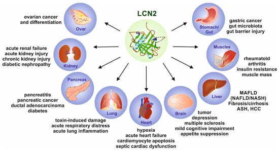 Importantly, LCN2 is reported to be expressed in numerous pathological conditions in many organs and tissues, making this lipocalin a reliable diagnostic and prognostic biomarker for identifying disease severities or the progression of malignancies in different organs such as the liver, kidney, lungs, bone, brain, and heart (Figure 5). Consequently, the diagnostic, therapeutic, and clinical relevance of LCN2 are currently the focus of researchers and clinicians []. A recent systematic analysis identified 70 ongoing clinical trials utilizing LCN2 in the diagnostic and prognostic setting as a key outcome measure [].