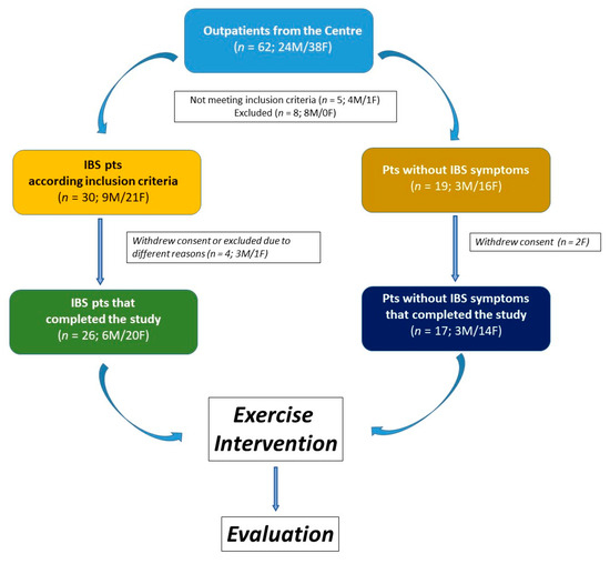 - Riezzo, G.; Prospero, L.; D’Attoma, B.; Ignazzi, A.; Bianco, A.; Franco, I.; Curci, R.; Campanella, A.; Bonfiglio, C.; Osella, A.R.; et al. The Impact of a Twelve-Week Moderate Aerobic Exercise Program on Gastrointestinal Symptom Profile and Psychological Well-Being of Irritable Bowel Syndrome Patients: Preliminary Data from a Southern Italy Cohort. J. Clin. Med. 2023, 12, 5359. [Google Scholar] [CrossRef] [PubMed]