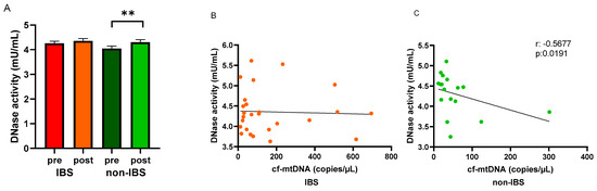 Levels of DNase activity and regression analyses. Panel (A): DNase activity (mU/mL) was determined in pre- and post-exercise serum samples from the 26 IBS patients and 17 non-IBS subjects. **: p < 0.01, paired t-test. Panel (B): correlation analysis between cf-mtDNA and DNase activity in the 26 IBS patients after the exercise program. Panel (C): correlation analysis between cf-mtDNA and DNase activity in the 17 non-IBS subjects after the exercise program. r, p: Spearman’s R correlation test. IBS = irritable bowel syndrome; pre and post = before and after 12 weeks of exercise program.