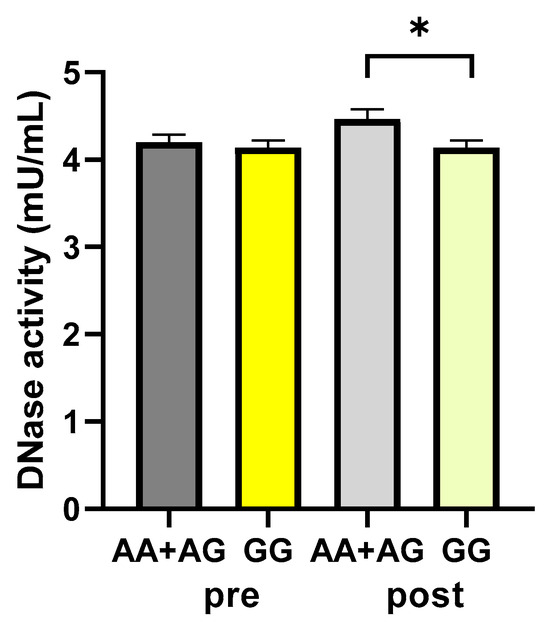 Subjects were categorized as carriers or not of the A allele (AA+AG and GG groups, respectively), which has been associated with higher-activity-harboring enzymes [31], and the DNase activity values were analyzed. According to the polymorphism, DNase activity values were not significantly different between the A carrier and non-A carrier groups, respectively, before the walking program (4.20 ± 0.08 vs. 4.14 ± 0.08 mU/mL, as A carrier and non-A carrier values, respectively; p: 0.5959, unpaired t-test). After exercise, a statistically significant difference was found between the carriers and non-carriers of the A allele, with values significantly higher in the A carriers (4.39 ± 0.11 vs. 4.08 ± 0.09 mU/mL, as A carrier and non-A carrier values, respectively; p: 0.0494, unpaired t-test) (Figure 6).