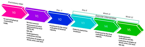 At enrolment, all participants gave informed consent and completed a structured questionnaire on sociodemographic factors, lifestyle, and medical history. PA levels were assessed using the validated International Physical Activity Questionnaire, Short Form (IPAQ-SF) [50]. In addition, patients completed the Gastrointestinal Symptom Rating Scale (GSRS) to assess GI symptoms. Selected patients’ symptom intensity and frequency resembling IBS were evaluated using the IBS-Severity Scoring System (IBS-SSS), as previously reported [32,33].