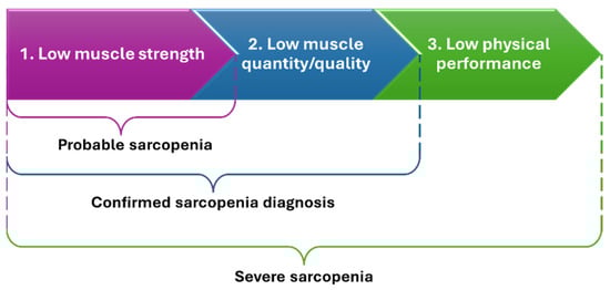 The concept of sarcopenia remains a topic of debate, with no widely acknowledged consensus on its diagnosis []. The diagnostic criteria for sarcopenia rely on examining muscular strength, mass, and performance []. Sarcopenia is classified as severe when low muscular strength, quantity/quality, and physical performance are registered together [,] (Figure 1). Possible tools for diagnosis include dual-energy X-ray absorptiometry, bioelectrical impedance analysis, computed tomography, magnetic resonance imaging, gait speed assessment, and muscle biopsy [].