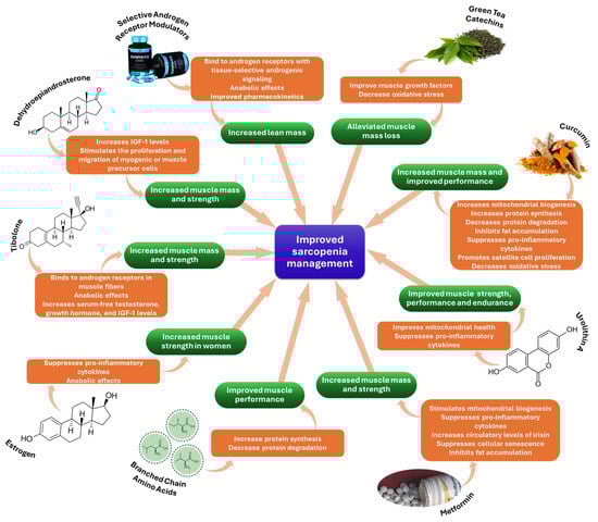 As people age, the circulation levels of many anabolic hormones decrease, which may lead to muscle mass and function changes. As a result, hormone modulation has been examined as the foundation of emerging sarcopenia therapeutic strategies, with testosterone supplementation being the most commonly involved drug for enhancing muscle mass and increasing muscle-protein anabolism [,,]. However, the findings of testosterone replacement therapy studies in males vary depending on the participant’s age, pre-treatment testosterone levels, and administration methods. These variables impede the assessment of therapy’s impact on disability and physical performance. In addition, potential side effects (e.g., peripheral edema, gynecomastia, polycythemia, and sleep apnea) have to be considered in parallel with therapeutic advantages. Another important disadvantage related to testosterone is that, in high amounts, this hormone may increase the risk of prostate cancer, imposing careful planning and monitoring during testosterone replacement therapy [].