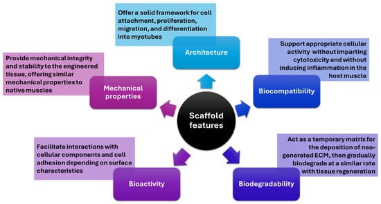 Skeletal muscle tissues have a limited inherent regenerative capacity, requiring external aid when damaged. Tissue engineering emerges as a viable strategy for reconstructing such tissue due to its ability to cultivate cells on a fabricated scaffold (i.e., three-dimensional solid biomaterials) resembling the native extracellular matrix (ECM), thereby facilitating the formation of skeletal muscle tissue. Developing an optimal scaffold is crucial for producing engineered muscle tissue that closely mirrors its natural counterpart and performs analogous functions []. In this respect, a series of features have to be considered when designing tissue-engineered scaffolds, as depicted in Figure 5.