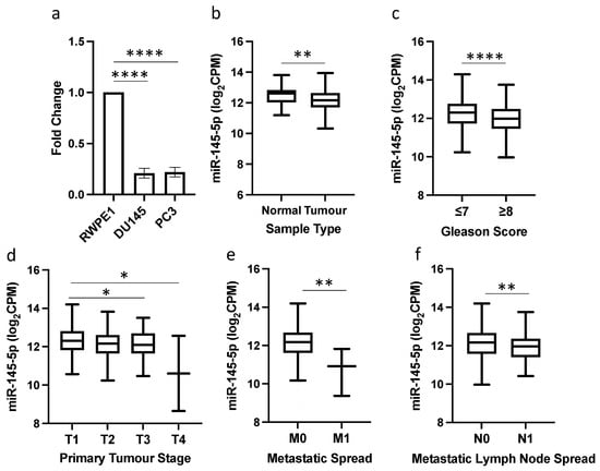 We first established that miR-145-5p expression was significantly reduced in prostate cancer cell lines and clinical samples compared to normal controls (Figure 1a,b). Further analysis of clinical samples showed that lower miR-145-5p levels were associated with more advanced cancer stage, as determined by clinicopathological parameters (Figure 1c–f). These findings are consistent with previous studies which found that lower levels of miR-145-5p expression are associated with poorer patient prognosis and treatment response [,].