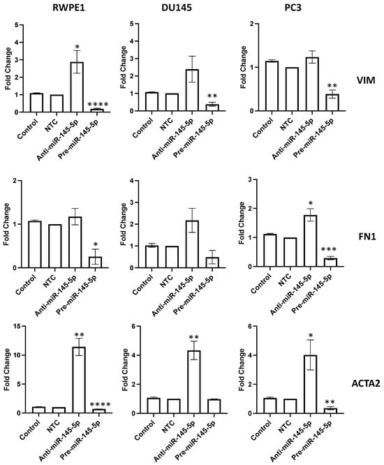 To validate the role of miR-145-5p in regulating EMT in prostate cells, the expression of several EMT markers were examined following transient knockdown or overexpression of miR-145-5p in RWPE1, DU145, and PC3 prostate cell lines. qRT-PCR analysis revealed that mRNA levels of mesenchymal markers vimentin (VIM), fibronectin 1 (FN1), and actin alpha 2 (ACTA2) were downregulated with miR-145-5p overexpression (Figure 3). Taken together, these results confirm that miR-145-5p modulates the expression of multiple EMT marker genes in prostate cell lines.