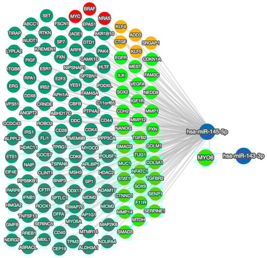miRTargetLink 2.0 visualization of miR-145-5p and MYO6 bidirectional network interactions. miR-145-5p and MYO6 were input items, while the connected nodes are gene/miRNA interactions validated by strong experimental evidence (qRT-PCR, Western blot, Luciferase reporter assay). Blue nodes: miRNAs; green nodes: genes; bright green nodes: EMT-associated genes; red nodes: genes significantly associated with prostate cancer; orange nodes: actin cytoskeleton modulators.