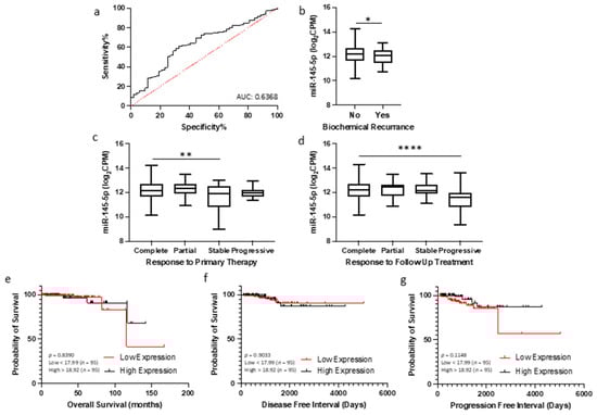 miR-145-5p as a prognostic biomarker for prostate cancer. (a) ROC curve analysis demonstrating that miR-145-5p shows potential for distinguishing between tumor and normal tissue in TCGA PRAD patient cohort. (b) Patients experiencing biochemical recurrence (BCR) showed significantly lower levels of miR-145-5p compared to those with no recurrence (p-values generated by unpaired two-tailed t-test; n, no recurrence = 407, recurrence = 61). (c) Significant difference in miR-145-5p levels between patient remission response after primary therapy (n, complete = 330, partial = 30, stable = 29, progressive = 23) and (d) follow up therapy (n, complete = 340, partial = 17, stable = 42, progressive = 24)(* p < 0.05, ** p < 0.01, **** p < 0.0001). For KM plots, patients were divided into quartiles based on miR-145-5p expression for (e) Overall survival, (f) Disease-free interval and (g) Progression-free interval. (p-values generated by log-rank (Mantel–Cox) test). ROC = Receiver operating characteristic. AUC = Area Under Curve. n = number.