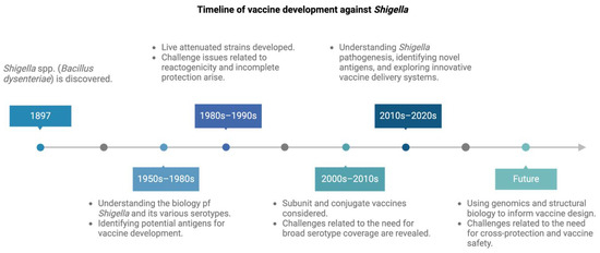 Timeline of vaccine development against Shigella infection. This figure illustrates key milestones in the field of Shigella research and vaccine development, highlighting breakthroughs and advances achieved over the years. Figure created using BioRender.com (accessed on 17 October 2023).