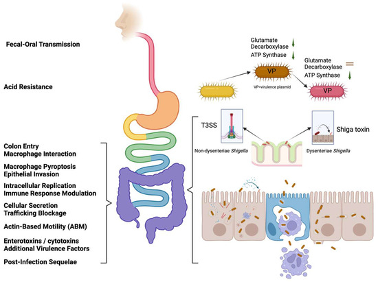 The genus we know as Shigella evolved from Escherichia coli ancestors through the loss of certain catabolic pathways and flagellar genes in parallel with the acquisition of a 210–230 kB virulence plasmid (VP), known as pINV (pINV A and pINV B) [28]. Specific examples of the VP include but are not limited to, pMYSH6000 in S. flexneri 2a, pSS120 in S. sonnei, and pWR100 in S. flexneri 5 [29]. Shigella is predominantly transmitted through the fecal–oral route, and upon ingestion, they activate acid resistance pathways that include the decarboxylase-independent AR1 pathway and AR2 (the glutamate decarboxylase system). The elevated acid resistance of Shigella, which is largely attributed to the glutamate decarboxylate system (gadA, gadB, and gadC), accounts for the low infectious dose of Shigella [30]. Shigella has a substantially elevated acid resistance relative to many other enteric pathogens, which allows the ingestion of a small number of organisms to result in clinical symptoms [31] (Figure 2). Shigella’s access to the colon is facilitated by the ShET-1 and -2 enterotoxins. Once in the colon, it enters the colonic mucosa by initially crossing M cells (Figure 2). Within large intestine lymphoid follicles, resident macrophages take up Shigella in a pathogen-driven process, which results in macrophage pyroptosis triggered by the type III secretion system (T3SS) secreted protein IpaB, causing the release of Shigella on the basolateral side of the colonic epithelium.