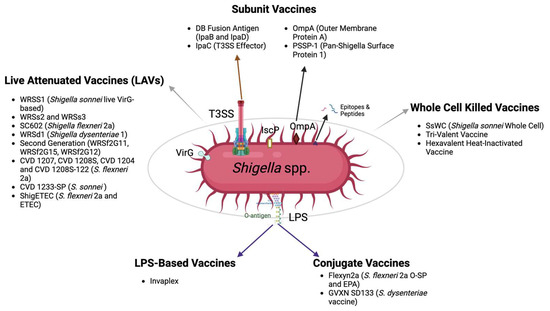 Current Shigella vaccines in development. This figure provides an overview of the diverse vaccine candidates currently under development against Shigella infections. Each vaccine candidate is displayed along with its corresponding target antigens. Figure created with BioRender.com (accessed on 17 October 2023).