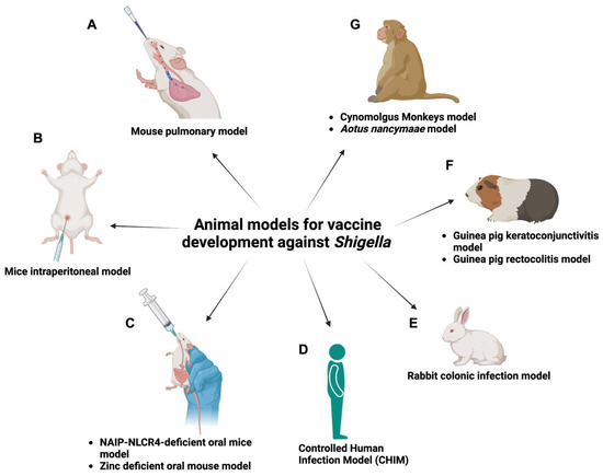 Animal models for vaccine development against Shigella infection. (Left) Various challenge routes can be used in mouse models. The figure outlines different routes, such as (A) intranasal delivery, (B) intraperitoneal injection, and (C) oral administration. (Right) Non-mouse animal models employed in Shigella vaccine development research. This includes (D,G) primate models, (E) rabbit models, and (F) guinea pig models. Each offers unique advantages and insights into Shigella pathogenesis and vaccine responses. Figure created using BioRender.com (accessed on 17 October 2023).