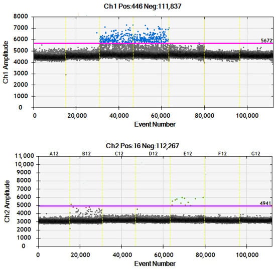 DdPCR was performed in a multiplex format using 11 μL of ddPCR Supermix for Probes (no dUTP, Bio-Rad, Hercules, CA, USA), 1.1 μL of ddPCR Mutant Assay HEX (Bio-Rad), 1.1 μL of ddPCR Wild-type Assay FAM, and 8 μL (maximum volume) of DNA isolated from serum. The amount of DNA from paraffin blocks was 0.008 ng. Water was used as a negative control (NTC). Droplets were generated using the QX 200 droplet generator (Bio-Rad, Hercules, CA, USA) in an 8-well plate containing 20 μL of reaction mixture and 70 μL of oil. 40 μL of the prepared mixture was transferred to a 96-well plate. The PCR reaction was performed in the T100 Thermal Cycler (Bio-Rad, Hercules, CA, USA) in the following thermal profile: initial denaturation at 95 °C for 10 min, followed by 40 cycles of denaturation at 94 °C for 30 s, annealing at 65 °C for 15 s, and extension at 98 °C for 10 min. The final step involved holding the reaction at 4 °C indefinitely. The temperature ramp rate was set at 2 °C/s. The fluorescence signal intensity was measured using the QX 200 droplet reader (Bio-Rad, Hercules, CA, USA). Samples with a droplet count greater than 10,000 were selected for analysis.