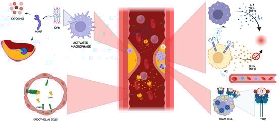 Another molecule produced by macrophages and involved in plaque stability is osteopontin (OPN). OPN is produced by activated macrophages from several stimuli, such as cytokines, ILs, and TGFβ []. Once released, OPN promotes the recruitment of monocytes and their adhesion to the endothelium, induces the expression of MMPs (in particular MMP-9), favors the degradation of the ECM, and stimulates cytokine expression from macrophages []. Moreover, elevated concentrations of OPN have been detected in ulcerated, hemorrhagic, necrotic, and inflamed plaques, suggesting that this protein might be used as a biomarker of plaque instability []. So, OPN has a crucial role in the progression of atherosclerotic plaques.