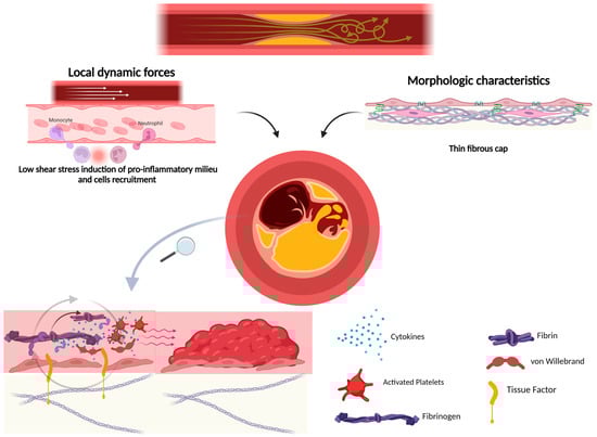Plaque rupture and thrombosis. Low shear stress triggers the activation of endothelial cells and leukocytes, leading to the upregulation of proinflammatory processes that increase the vulnerability of the lesions. The rupture of the plaque results in compromised endothelial integrity, which is the primary determinant of vascular tone, inflammation activation, and the diffusion of molecules into the subendothelial layer. Upon endothelial damage, platelets adhere to the vascular wall, initiating the formation of a platelet-rich thrombus through the interaction between the platelet glycoprotein (GP) Ibα receptor and von Willebrand factor (vWF), expressed by the injured endothelium. In addition, the GPIbα receptor recruits circulating leukocytes by binding integrins and P-selectin, thereby perpetuating the inflammatory cascade (Created with BioRender.com).