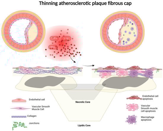 In the fibrous cap, VSMCs and collagen are noted to be present [], while the necrotic core of the plaque exhibits minimal collagen but a significant amount of free cholesterol. Transcription factors SP1, SP3, and AP1, interacting with the collagen promoter, play a role in the transcription of type I collagen in these cells []. The absence of collagen serves as an indication of VSMC loss, rendering the plaque vulnerable []. Reduced metalloproteinase activity may contribute to impaired collagen deposition. Collagen is crucial for providing tensile strength to the fibrous cap, and its absence or minimal presence may result in thinning when VSMCs are depleted from the cap, contributing to a rupture with reduced collagen content []. The overproduction of VSMCs can lead to plaque growth dependent on angiogenic factors []. Type VIII collagen, typically present in small amounts in normal arteries and produced by macrophages and VSMCs, enhances the migration and growth of VSMCs through the extracellular matrix. Fibrous cap characteristics, including thickness, cellularity, matrix composition, and collagen content, play vital roles in plaque stability. The exact mechanism of plaque rupture involves cap thinning, elevated inflammatory cytokines, matrix-digesting proteases, decreased collagen synthesis, and the presence of injured or apoptotic cells within the necrotic core. Cells contributing to plaque formation are implicated in plaque rupture and subsequent thrombosis. Molecular mediators associated with atherogenesis may alter collagen metabolism, thinning or weakening the fibrous cap. Inflammatory cells secrete cytokines, growth factors, TF, IFN-γ, MMPs, and reactive oxygen species. The accumulation of free cholesterol induces the apoptosis of macrophage-derived foam cells, contributing to the formation of the necrotic core. Excess extracellular unesterified cholesterol crystallizes, leading to complicated atheroma and the eventual total occlusion of coronary artery branches. Continued inflammatory responses, driven by proinflammatory cytokines, destabilize atherosclerotic plaques, with IFN-γ, IL-18, growth differentiation factor-15, and TNF-like weak inducer of apoptosis promoting destabilization, while TGF-β causes stabilization []. Proinflammatory cytokines such as IFN-γ, TNF-α, and IL-1β stimulate macrophage and smooth muscle cell apoptosis, thinning the fibrous cap (Figure 3). Macrophages infiltrate the thinned fibrous cap, secreting inflammatory cytokines and MMPs, playing a pivotal role in weakening and ultimately rupturing the atherosclerotic plaque. Necrosis of the vulnerable plaque results from a combination of macrophage death and defective phagocytic clearance of apoptotic cells, accelerating or inducing plaque disruption through the release of inflammatory cytokines and matrix proteases. Mechanical stress from the necrotic core on the overlying cap may also contribute to plaque rupture [].