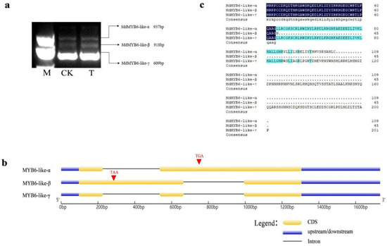 Cloning and structure analysis of MdMYB6-like and its novel variants: (a) the three alternative spliced variants of MdMYB6-like confirmed by RT-PCR using ‘Starking Delicious’ cDNA; (b) diagrammatic representation of the genomic and protein structure of the three alternative spliced variants. The red triangle indicates a premature termination codon (PTC); (c) amino acid sequence analysis of the three alternative spliced variants.