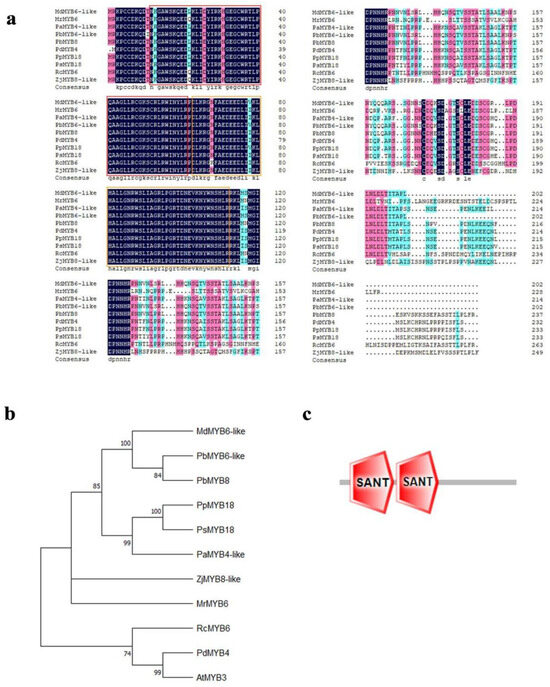 The blastp function of the NCBI website was used to find MYB transcription factors highly homologous to MdMYB6-like in other plants, facilitating protein sequence comparison. The results showed that the selected MYB transcription factors all contain two conserved R2 and R3 MYB structural domains, which is a characteristic of the R2R3-MYB transcription factor (Figure 2a). The constructed phylogenetic tree showed that MdMYB6-like was closely related to PbMYB8 in pear (Figure 2b). Additionally, previous studies indicated that PbMYB8 is involved in the expression of lignin metabolism pathway in pear. Therefore, we presumed that MdMYB6-like also plays an important role in the lignin metabolic pathway [32]. The predicted protein structure indicates that MdMYB6-like contains two conserved structural domains, indicating its membership in the SANT supergene family (Figure 2c). The SANT domain is involved in histone acetylation and deacetylation and is associated with chromatin remodeling [33].