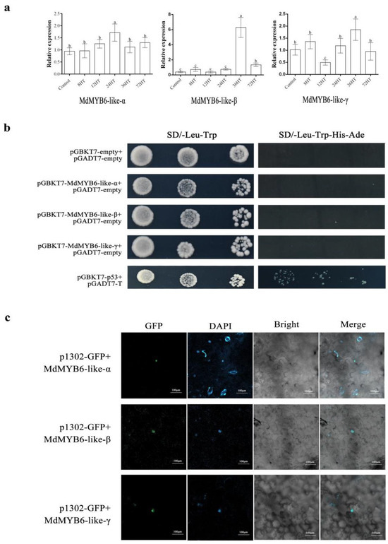 First, we validated the auto-activation activity of MdMYB6-like-α, MdMYB6-like-β and MdMYB6-like-γ using yeast two-hybridization. We co-transformed BD-MdMYB6-like-α, BD-MdMYB6-like-γ and BD-MdMYB6-like-β into the yeast strain AH109 together with the empty pGADT7 vector. Co-transformation of empty pGADT7 and pGBKT7 vectors was used as a negative control, and co-transformation of pGBKT7-p53 and pGADT7-T vectors was used as a positive control. The results showed that the three variants could grow normally on SD/-Trp/-Leu medium but not on SD-Leu/-Trp/-His/-Ade medium, so we concluded that none of the three variants had auto-activation activity (Figure 3c).