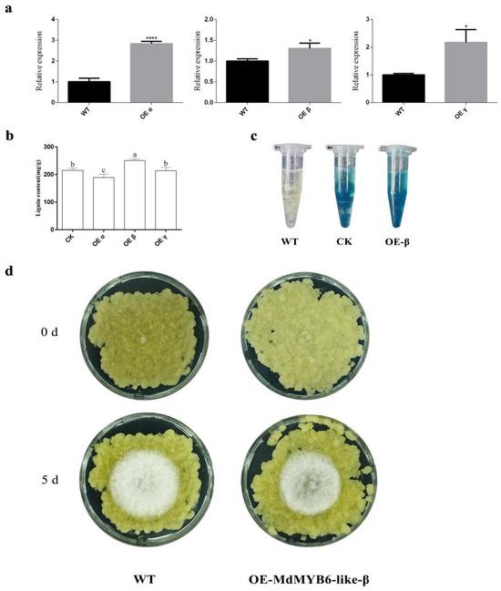 In order to investigate the function of MdMYB6-like in the disease resistance of apple leaves, we constructed the three variants into the overexpression vector pCAMBIA2300 and subjected ‘Gala’ apple leaves to transient overexpression experiments. We used overexpression of the empty pCAMBIA2300 vector as a control in the experiment. We immersed ‘Gala’ apple leaves in resuspended Agrobacterium with infiltration buffer and created a vacuum environment to promote infection. The transient overexpression experiments increased the expression levels of the various variants in apple leaves, respectively, as shown by RT-qPCR experiments (Figure 4a). After that, we analyzed the lignin content of the overexpressed apple leaves. The results showed that overexpression of MdMYB6-like-β variants significantly increased the lignin content in leaves (Figure 4b).