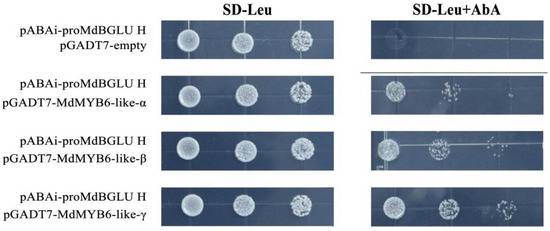 The NCBI website was used to locate the promoters of the target genes. We used the PlantCARE website (http://bioinformatics.psb.ugent.be/, accessed on 12 April 2023) for promoter sequence analysis [60]. MdBGLU H (NCBI ID: XM_029099134) promoter sequences were cloned into the pAbAi vector for Y1H assays (Supplemental Table S1). The constructed vector plasmids were digested by Bst B I, and the linearized products were transferred into yeast strain Y1HGold and screened on a single-deficient (SD-Ura) medium after confirming the integration of decoy sequences by colony PCR. The AD-MdMYB6-like-α, AD-MdMYB6-like-β, AD-MdMYB6-like-γ and empty pGADT7 vector plasmids from the Y2H assays were transferred into the Y1HGold (Bait-AbAi) strains. Screening of positive strains was performed on an SD/-Leu medium containing different concentrations of ABA to verify the interaction between promoters and proteins. Empty pGADT7 vector was used as the control.