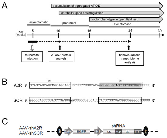 Experimental design: (A) Timeline of disease onset and progression in SCA7140Q/5Q knockin mice. Mice were injected retro-orbitally into their blood stream at an asymptomatic stage of 5–6 weeks of age. A prodromal period is characterized by progressive molecular alterations, notably the accumulation of aggregated mATXN7 observed at 8–10 weeks and the downregulation of PC type-specific genes from 12 weeks. The symptomatic period is characterized by progressive motor and behavioral dysfunctions that manifest from 16 weeks, as revealed by an open field test. The lifespan of SCA7 mice is shortened to about 55–60 weeks. (B) Nucleotide sequence of A2R and scrambled (SCR) shRNAs. Ss, sense strand; as, antisense strand. The as of shA2R corresponds to A2 sd-siRNA [8]. (C) Construct of AAV PHP.eB vector containing two expression cassettes: CMV promoter driving eGFP to trace the efficiency of AAV transduction in vivo and H1 promoter driving shA2R or shSCR. ITR, inverted terminal repeats.