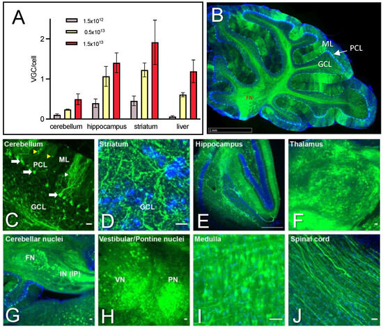 AAV PHP.eB efficiently transduces cerebellar and cerebellar-associated structures. (A) Viral genome copy per cell (vgc/cell) in different mouse tissues 4 days after injection of AAV PHP.eB at increasing doses (vg/kg). Data are expressed as mean ± SEM (n = 4/tissue). (B) Detection of eGFP signal (green) in the majority of PCs on sagittal sections of the cerebellum of mice injected with 1.5 × 1013 vg/kg and analyzed 4 weeks post-injection. (C) Higher magnification of PC showing eGFP-positive soma (white arrows) and dendritic arbors (white arrowhead). A number of cells in the molecular layer (yellow arrowheads) (likely stellate and basket neurons) were also eGFP-positive. (D–E) An eGFP-positive signal was observed in fibers of striatal neurons (D) and the hippocampal molecular layer (E). (F–J) An eGFP-positive cell soma was detected at high density in the thalamus (F), cerebellar nuclei (G), vestibular and pontine nuclei (H), and the medulla (I), and the spinal cord shows eGFP-positive fibers (J). FN, fastigial nucleus; GCL, granule cell layer; IP, interposed nucleus; IN, intracerebellar nucleus; ML, molecular layer; PC, Purkinje cell; PCL, PC layer. Scale bars: ((B) 1 mm; (C,J) 10 µm; (D) 5 µm; (E–I) 50 µm).