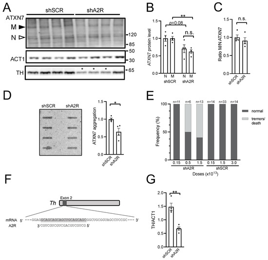 Analysis of the efficacy, allele selectivity, and safety of AAV-shA2R injection in SCA7 mice. (A) Representative western blot analysis of soluble normal (N) and mutant (M) ATXN7, Actin-1 (ACT1), and Tyrosine hydroxylase (TH) in the cerebellum of SCA7 mice injected with AAV-shA2R or AAV-shSCR at 1.5 × 1013 vg/kg. Mice were injected at the age of 6 weeks and were sacrificed at 10 weeks for analysis. The asterisk indicates 3 mice that developed a tremor-like phenotype. (B) Signal intensities of soluble nATXN7 and mATXN7 were normalized to ACT1 levels and plotted relative to shSCR conditions with the mean set at 1. (C) Ratio of signal intensities of mATXN7/nATXN7 normalized to ACT1 levels. (D) Signal intensities of aggregated mutant ATXN7 in cerebellar protein extracts assessed using on filter trap assay. The intensities were plotted relative to SCR conditions. (E) Dose dependent adverse side effects of shA2R. The affected mice (light grey) either presented with a tremor phenotype and had to be sacrificed or died during the course of the experiment. (F) A 20-nucleotide complementarity to the antisense sequence of shA2R with the mouse Th transcript. (G) Signal intensities of TH normalized to ACT1 levels. Data are expressed as mean± SEM and were analyzed using two-tailed Student’s t-test. * p < 0.05; ** p < 0.01. n.s. for not significant.