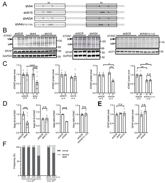 In vivo analysis of the efficacy, allele selectivity, and safety of shRNAs A4, A15, AG4, and A4(P10,11). (A) Nucleotide composition of shRNAs. ss, sense strand; as, antisense strand. The as of shA4 and shA15 corresponds to A4 sd-siRNA and A15 sd-siRNA [8]. (B) Representative western blot analysis of ATXN7, ACT1, GFAP, and GAPDH in the cerebellum of SCA7 mice injected with different AAV vectors. The 5-week-old SCA7 mice were injected at 1.5 × 1013 vg/kg with AAV-shA4, AAV-shA15, AAV-shAG4, or AAV-shSCR, and at 3.0 × 1013 vg/kg with AAV-shA4(P10,11A) and AAV-shSCR. Mice were sacrificed at 5 to 7 weeks post-injection for analysis, depending on the experimental group. Note that the blot in the middle panel was spliced in the center (vertical dotted line) to remove samples from an unrelated treatment and did not have other manipulation. (C) Signal intensities of normal (N) and mutant (M) ATXN7 normalized to GAPDH or ACT1 levels and plotted relative to SCR conditions with mean set at 1. The graph for the experimental group AAV-shA4 and AAV-shSCR combined data from two independently injected cohorts of mice. (D) Ratio of signal intensities of mATXN7/nATXN7 normalized to GAPDH or ACT1 levels and plotted relative to SCR conditions with the mean set at 1. (E) Signal intensities of GFAP normalized to GAPDH levels and plotted relative to SCR conditions with mean set at 1. (F) Frequency of adverse side effects of the different AAV-shRNAs injected at the indicated doses. Data are expressed as mean± SEM and were analyzed using two-tailed Student’s t-test. * p < 0.05; ** p < 0.01; *** p < 0.001; **** p < 0.0001. n.s. for not significant.