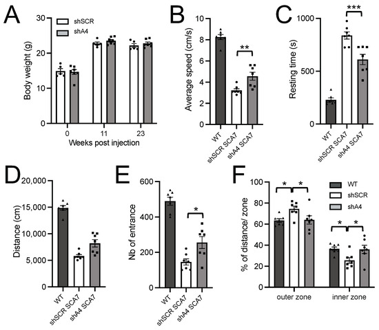 SCA7 adult mice were shown to plateau at a lighter weight than WT mice and to show deficits in various sensori-motor tests [23]. On the basis of the preceding phenotypic data, we estimated that a therapeutic treatment leading to a 25% improvement in body weight and open field test performance was likely to be significantly detected from 16 weeks of age at p < 0.05 with a power greater than 80%. To assess whether the lowering effect of AAV-shA4 provides a beneficial effect on the phenotype, we proceeded with intravascular injections of 5-week-old SCA7 mice. AAV-shA4 treatment did not improve the body weight of mice tested at 11 and 23 weeks post-injection when compared to the control AAV-shSCR (Figure 5A). However, at 23 weeks post-injection, SCA7 mice treated with AAV-shA4 showed improved spontaneous locomotor activity. In open field tests of 30 min duration, treated mice had an increased average speed (by 26%, p = 0.0078), a reduced resting time (by 37%, p = 0.0008), and, hence, traveled longer distances (by 26%, p = 0.0082) than control mice (Figure 5B–D). Moreover, AAV-shA4-treated SCA7 mice entered more frequently in the inner zone of the open field than AAV-shSCR-treated mice (Figure 5E), and they had a ratio of inner/outer zone traveling distance similar to WT mice (Figure 5F), suggesting a reduction in thigmotaxis.