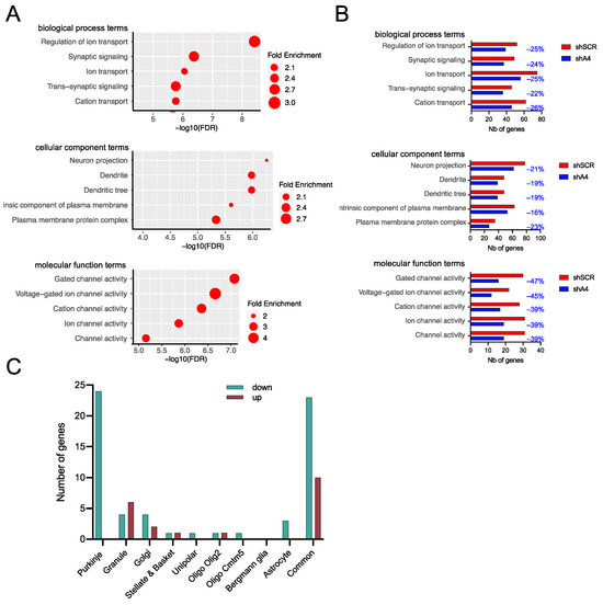 Development of the sensorimotor phenotypes in SCA7 mice correlated with the deregulation of cerebellar genes, including the downregulation of PC type-specific genes [23]. To assess whether AAV-shA4 treatment ameliorates the expression of deregulated genes, we performed RNA-seq analysis of the cerebellum of AAV-shA4-treated SCA7 mice at 23 weeks post-injection and compared them to AAV-shSCR-treated SCA7 mice and age-matched untreated WT mice. Compared to WT mice, AAV-shSCR-treated SCA7 mice showed 426 DEGs with an FC > 1.3 (adjusted p < 0.05), including 311 down-regulated and 115 up-regulated genes (Figure S7A). GO analysis revealed high enrichment in terms associated with ion transport and synaptic signaling biological processes, dendritic cellular components, and ion channel molecular functions (Figure 6A). These enrichments are consistent with enriched GO terms reported previously for DEGs in the cerebellum of 40-week-old untreated SCA7 mice [23] (Figure S8) and could constitute a signature of SCA7 disease progression in mice. Using available datasets [23], we assigned cerebellar cell-type-specific distribution to 269 of 426 DEGs, and we subsequently determined that 104 PC type-specific genes were downregulated in AAV-shSCR-treated SCA7 mice (Figure S7B). This confirms that PC pathology represents a major characteristic of AAV-shSCR-treated SCA7 mice, as previously reported for untreated SCA7 mice [23], and this shows that the AAV transduction per se does not affect the pathology in these neurons.