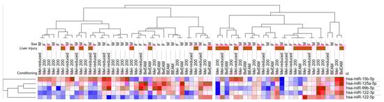 Overall, exploratory analysis using heatmap and hierarchical clustering yielded two clusters of patients with distinct miRNA profiles and frequencies of liver injury occurrence (Figure 1 and Supplementary File S1).