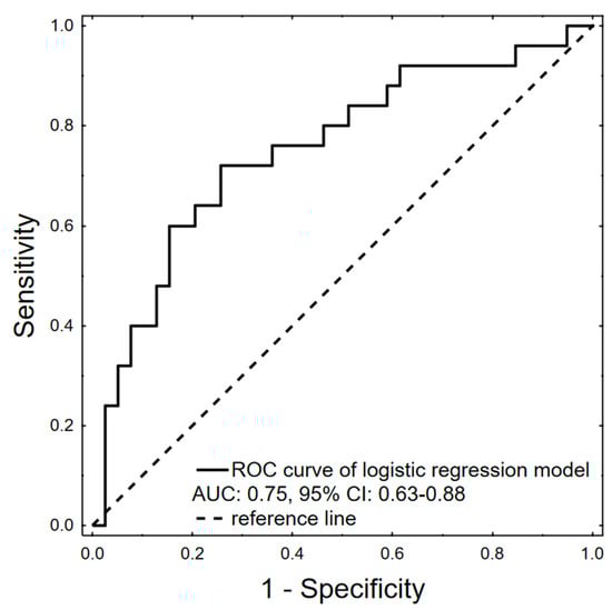Our model in 10-fold cross-validation preserved its diagnostic potential with an ROC AUC: 0.75, 95% CI: 0.63–0.88 and at optimal cut-off reached 72.0% sensitivity and 74.4% specificity (Figure 3).