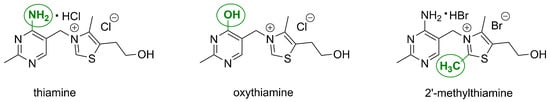 Structural comparison of thiamine, oxythiamine, and 2′-methylthiamine. The differences in the structure are marked in green.