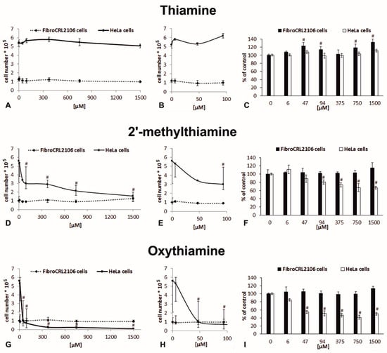 Comparison of the antiproliferative activity of thiamine, oxythiamine, and 2′-methylthiamine on fibroblasts and HeLa cells. Total number of cells (A,D,G); high resolution of the total number of cells in the concentration range 0–100 µM (B,E,H); MTT assay results (C,F,I); #—statistically significant differences compared with the control group; mean ± SE (A–C,F,I); medians ± maximum and minimum values (D,E,G,H); Student’s t-test, p < 0.01 (A–C,F,I); Mann–Whitney U test, p < 0.01 (D,E,G,H).