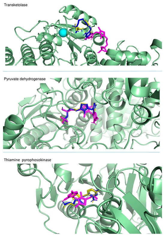 The comparison of docked thiamine (blue), oxythiamine (yellow), and 2′-methylthiamine (magenta) or their pyrophosphate into transketolase, pyruvate dehydrogenase, and thiamine pyrophosphokinase. The matches with the highest affinity with each enzyme are shown.