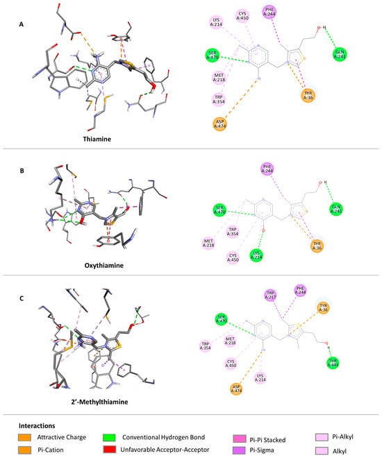 Binding interactions of thiamine pyrophosphokinase with (A) thiamine, (B) oxythiamine, and (C) 2′-methylthiamine resulting from docking studies.