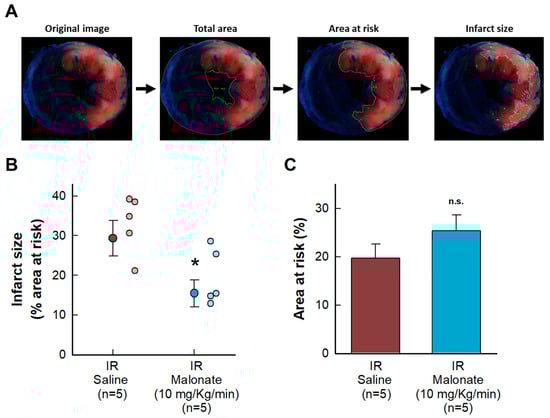 Effects of intravenous disodium malonate (10 mg/kg/min), given during the last 5 min of coronary occlusion and the first 15 min of reperfusion, on infarct size in mice subjected to 45 min of LAD occlusion and 24 h of reperfusion. (A) Method used to delineate the total slice area and the size of the area at risk and infarction. (B) Mean infarct size and individual values in both groups of animals. (C) Size of the area at risk. n.s. indicates no significant differences, whereas * (p < 0.05) indicates significant differences vs. control hearts (Student’s t test, n = 5/group).