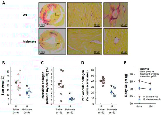 Effects of intravenous disodium malonate (10 mg/kg/min) given during the last 5 min of coronary occlusion and the first 15 min of reperfusion on scar area and interstitial and perivascular fibrosis in mice subjected to 45 min of LAD occlusion and 28 days of reperfusion. The upper panel (A) shows representative images of post-infarction scarring and interstitial and perivascular fibrosis in the remote myocardium, as assessed using Picrosirius Red staining, for a control mouse and a malonate-treated animal. Lower graphs depict mean and individual values for scar area (B), interstitial collagen deposition (C), and perivascular fibrosis (D) in the same groups of mice. * (p < 0.05) indicates significant differences vs. control hearts (Student’s t test, n = 9 for saline-treated animals and 5 for malonate-treated animals). (E) Changes in body weight in control animals and in malonate-treated mice. Repeated measures ANOVA demonstrated no interaction between time and treatment (n = 9 for saline-treated animals and 5 for malonate-treated animals).