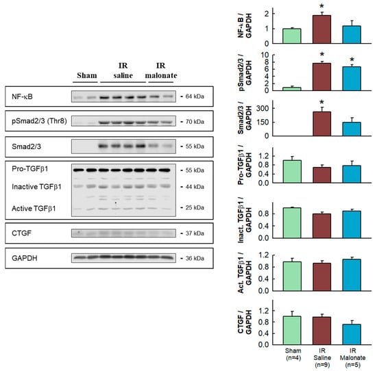 Western blot analysis of fibrotic markers in remote myocardium. Left panels show representative Western blots for NF-κB, Smad2/3 and pSmad2/3, TGFβ1, CGTF, and GAPDH in tissue extracts from sham-operated mice and from animals subjected to 45 min of LAD occlusion followed by 28 days of reperfusion and treated with or without malonate during initial reflow. The right panels show corresponding quantifications. * (p < 0.05) indicates significant differences vs. sham-operated mice (ANOVA and Tukey post-hoc tests, n = 4 for sham animals, 9 for saline-treated mice, and 5 for malonate-treated animals).