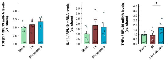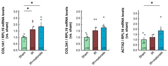 Myocardial levels of mRNAs coding for proteins involved in collagen synthesis (COL1A1, COL3A1, ACTA2, and TGFβ1) and in the inflammatory response (IL-1β and TNFα) in tissue extracts from sham-operated mice and from animals subjected to 45 min of LAD occlusion followed by 28 days of reperfusion and treated with or without malonate during initial reflow. Values are expressed as fold change with respect to RPL19, used as a housekeeping gene, and with respect to sham-operated animals. * (p < 0.05) indicates significant differences vs. indicated groups (ANOVA and Tukey post-hoc tests; n = 5–6 for sham animals, 7 for saline-treated mice, and 5 for malonate-treated animals).