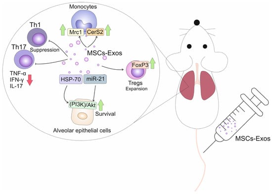 Molecular mechanisms responsible for MSC-Exo-dependent suppression of immune cells in fibrotic lungs. MSC-Exos altered cellular-make up of fibrotic lungs by affecting survival, phenotype and function of lung-infiltrated immune cells. In inflamed and fibrotic lungs, MSC-Exos reduced production of inflammatory cytokines (TNF-α, IFN-γ, IL-17) in Th1 and Th17 lymphocytes (arrow down) and increased the synthesis of immunoregulatory proteins (Mrc1 and CerS2) in monocytes (arrow up), ameliorating their immunosuppressive properties. By delivering anti-apoptotic miR-21 and HSP-70, MSC-Exos improved survival and viability of alveolar epithelial cells, further contributing to the attenuation of lung fibrosis.