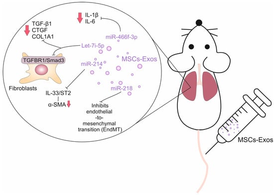 Xie and colleagues recently showed that BM-MSC-Exo-sourced miR-214 inhibited progression of bleomycin-induced pulmonary fibrosis by suppressing the IL-33/ST2 axis in fibrotic lungs [56]. IL-33 is an immunomodulatory cytokine and alarmin which is released from injured endothelial and alveolar epithelial cells during the progression of detrimental inflammatory response in the lungs [60]. IL-33 promotes lung fibrosis by recruiting and activating lung-infiltrated inflammatory immune cells (monocytes, mast cells, Th2, Th17 lymphocytes) by inducing enhanced secretion of pro-fibrotic cytokines (TGF-β and IL-13), by activating fibroblasts causing them to differentiate into myofibroblasts and by promoting EMT [60]. Xie and colleagues revealed that BM-MSC-Exo-sourced miR-214 targeted IL-33 and blocked the IL-33/ST2 axis in fibroblasts and lung-infiltrated immune cells, which reduced collagen fiber accumulation and α-SMA production, resulting in the attenuation of bleomycin-induced pulmonary fibrosis in experimental mice [56].