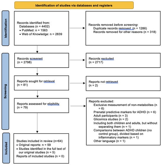 Study Selection: The last search in both databases was conducted unilaterally by a single reviewer in February 2024. Following the initial search process, we identified 4402 results, of which 1287 duplicates were eliminated. Subsequently, after excluding materials other than articles (such as conference abstracts and correspondences), systematic reviews, and meta-analyses, 2797 studies remained for title and abstract screening. The same reviewer screened the studies based on inclusion and exclusion criteria, initially reviewing titles and abstracts and subsequently examining full texts. At this stage, 80 clinically relevant studies were identified for full-text review. Sequentially, 21 of these were excluded for various reasons: 6 studies which identified potentially predictive prenatal markers for ADHD [29,30,31,32,33,34]; 3 which comprised exclusively adult samples [35,36,37], as well as 1 study that included both children and adults without separately presenting differences between healthy children and those with ADHD [38]; 5 studies that did not measure the metabolites themselves [39,40,41,42,43]; 2 that were based on glycomic markers [44,45]; 2 for which the full text could not be obtained [46,47]; 1 study which compared ADHD children divided on the basis of inflammatory marker levels, with no control group [48]; and 1 study which had the full text available only in Catalan [49]. Additionally, through a thorough examination of these articles, as well as the identified reviews and meta-analyses, we identified 5 additional resources suitable for inclusion in the present review, resulting in a final number of 64 included studies. The entire process is illustrated in Figure 1.